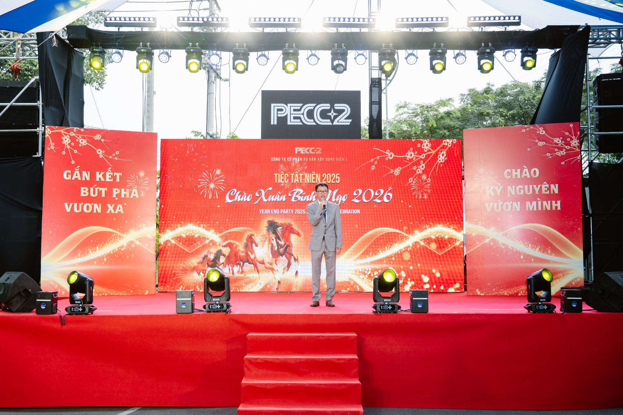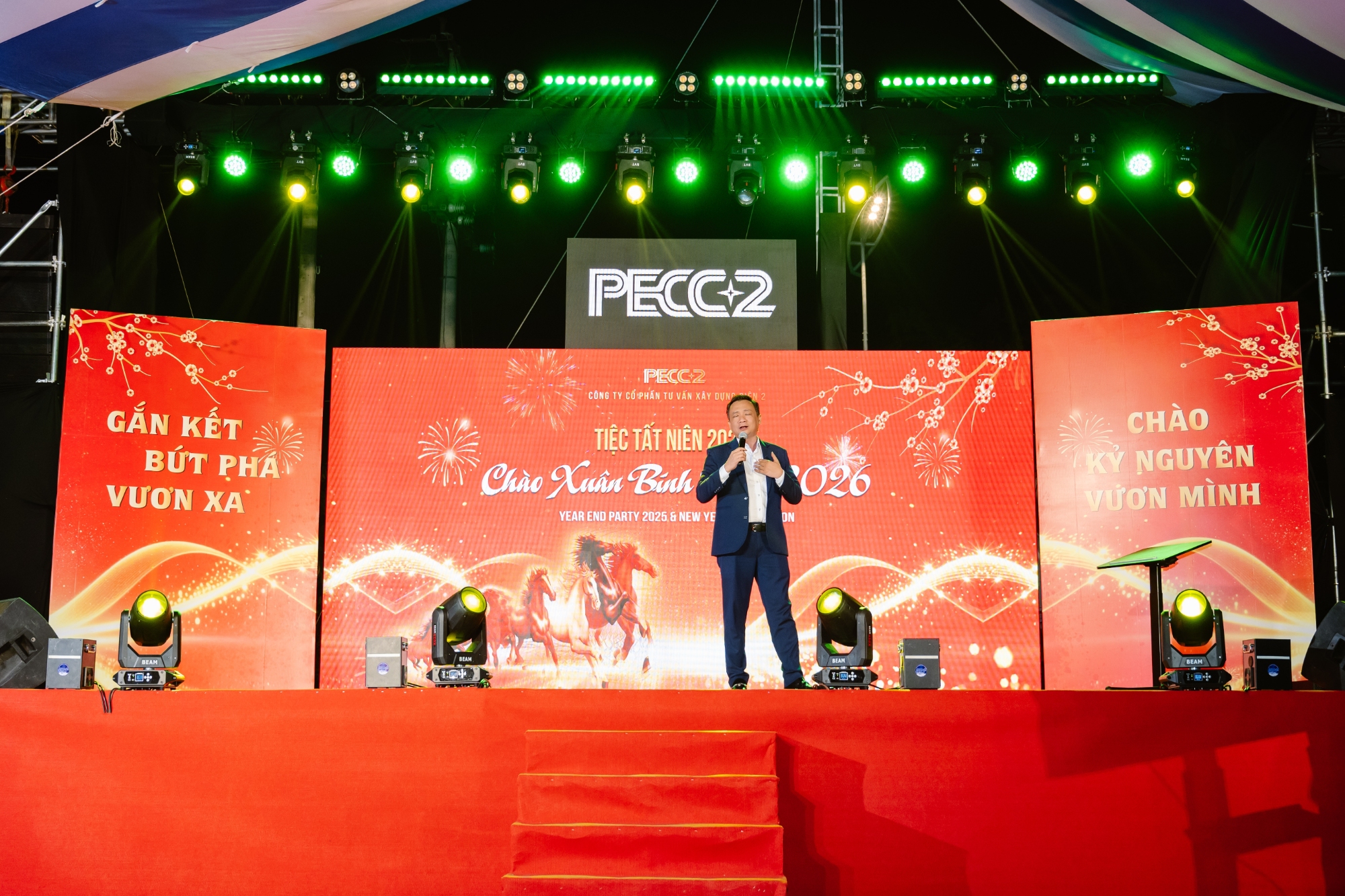 Mở đầu chương trình, không gian tiệc nhẹ kết hợp cùng lighting show và phần chào mừng đã nhanh chóng khuấy động bầu không khí sự kiện. Tại đây, Ông Nguyễn Chơn Hùng - Chủ tịch HĐQT Công ty - đã có những chia sẻ ngắn gọn, chân thành, ghi nhận những nỗ lực, tinh thần trách nhiệm và sự đồng hành của tập thể người lao động PECC2 trong suốt một năm 2025 đã qua, đồng thời gửi gắm niềm tin và kỳ vọng vào chặng đường phía trước.