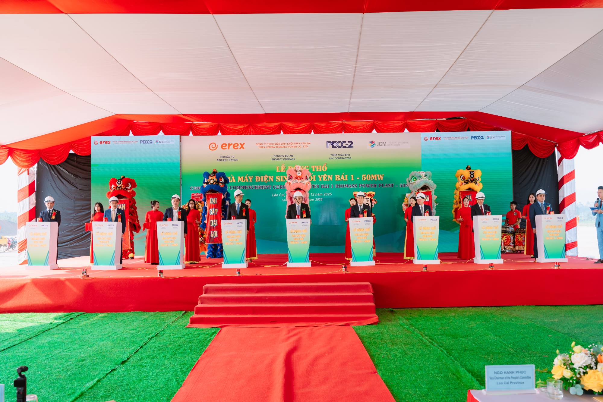 Tham dự Lễ động thổ có ông Ito Naoki - Đại sứ đặc mệnh toàn quyền Nhật Bản tại Việt Nam; Đồng chí Ngô Hạnh Phúc – Phó Chủ tịch UBND tỉnh Lào Cai, cùng đại diện Lãnh đạo các Sở, Ban, Ngành của tỉnh Lào Cai, lãnh đạo xã Đông Cuông; Về phía Công ty Cổ phần eREX (Nhật Bản) có Ông Honna Hitoshi - Chủ tịch kiêm Tổng giám đốc Công ty, Ông Hagiya Munetaka – Tổng Giám đốc Công ty TNHH Điện sinh khối eREX Yên Bái. Về phía Công ty Cổ phần Xây dựng điện 2 (PECC2) - Tổng thầu EPC dự án, có Ông Nguyễn Chơn Hùng - Chủ tịch HĐQT công ty tham dự buổi lễ.