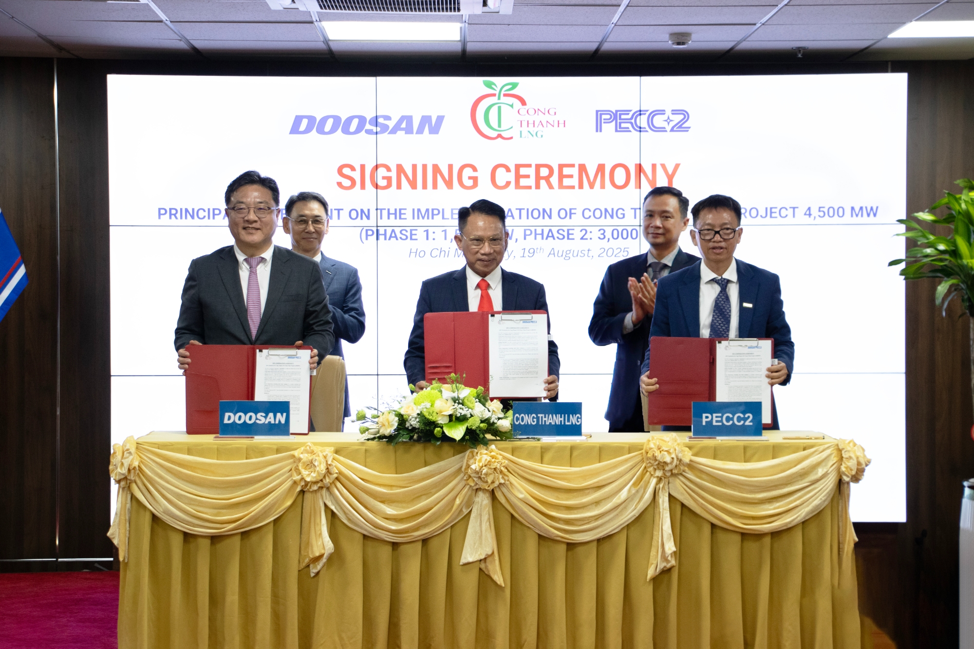 Chiều ngày 19/8/2025, tại Tòa nhà PECC2 Innovation Hub, Công ty Cổ phần Nhiệt điện Công Thanh và Liên danh Doosan Enerbility (Hàn Quốc) - Công ty Cổ phần Tư vấn Xây dựng Điện 2 (PECC2) đã chính thức ký kết thỏa thuận nguyên tắc thực hiện Dự án Nhà máy điện Công Thanh 4.500MW (Giai đoạn 1: 1.500MW; Giai đoạn 2: 3.000MW).