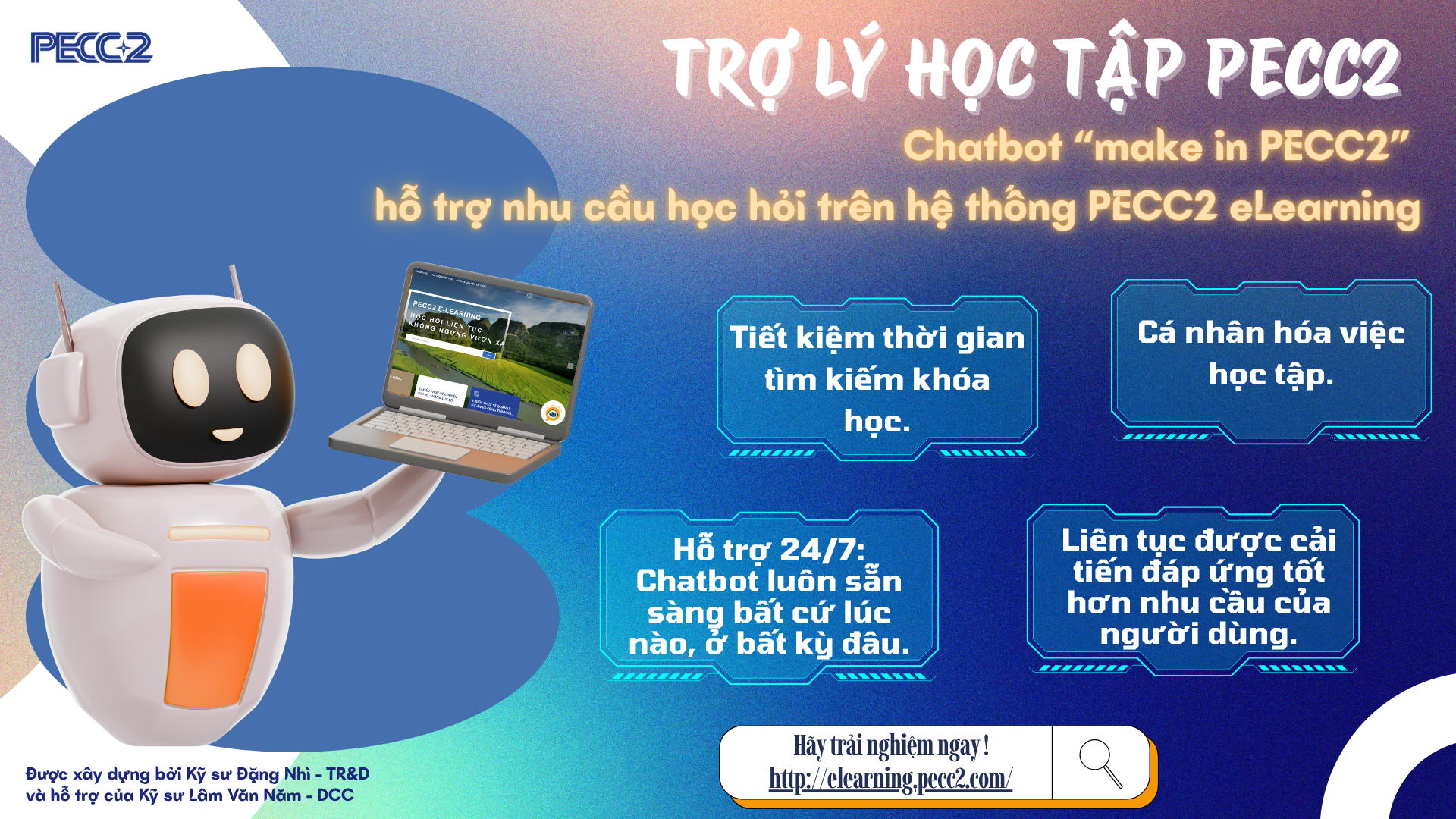 "Trợ lý học tập PECC2" là một chatbot được tích hợp trực tiếp vào Hệ thống PECC2 eLearning. Chatbot này được trang bị trí tuệ nhân tạo (AI) và có khả năng: